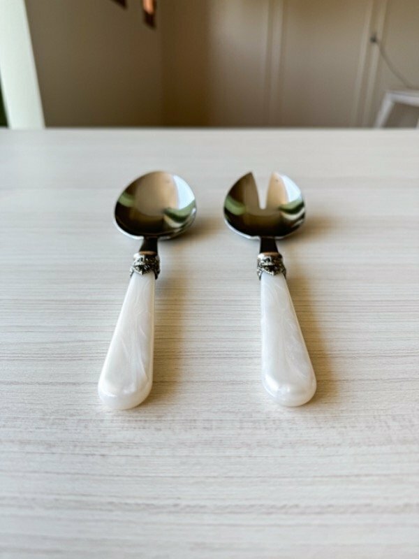 Elegante juego de tenedor y cuchara para ensalada, realizado en acero inoxidable y mango efecto nacarado.