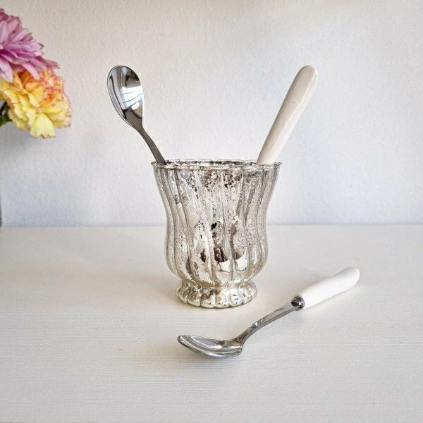 Cucharitas de acero plateado con cabo de porcelana blanco.