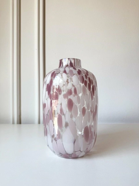 Hermoso florero realizado de manera 100% artesanal en vidrio reforzado con pintitas en color rosa.