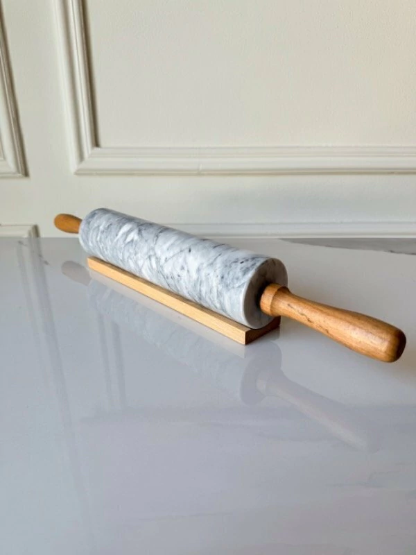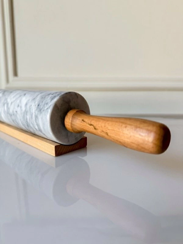 Espectacular palo de amasar realizado en mármol con agarradera de madera y ahora base para apoyar.