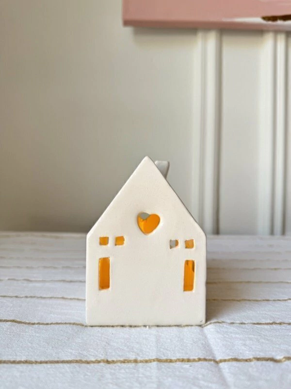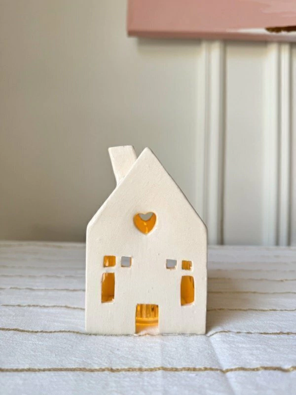 Casa de cerámica realizada 100% a mano en color crudo, con puertas y ventanillas que dejará pasar la luz de la velita. Incluye vela a pila para que dure toda la noche.