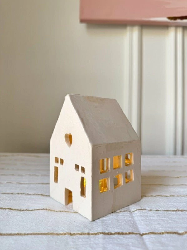 Casa de cerámica realizada 100% a mano en color crudo, con puertas y ventanillas que dejará pasar la luz de la velita. Incluye vela a pila para que dure toda la noche.