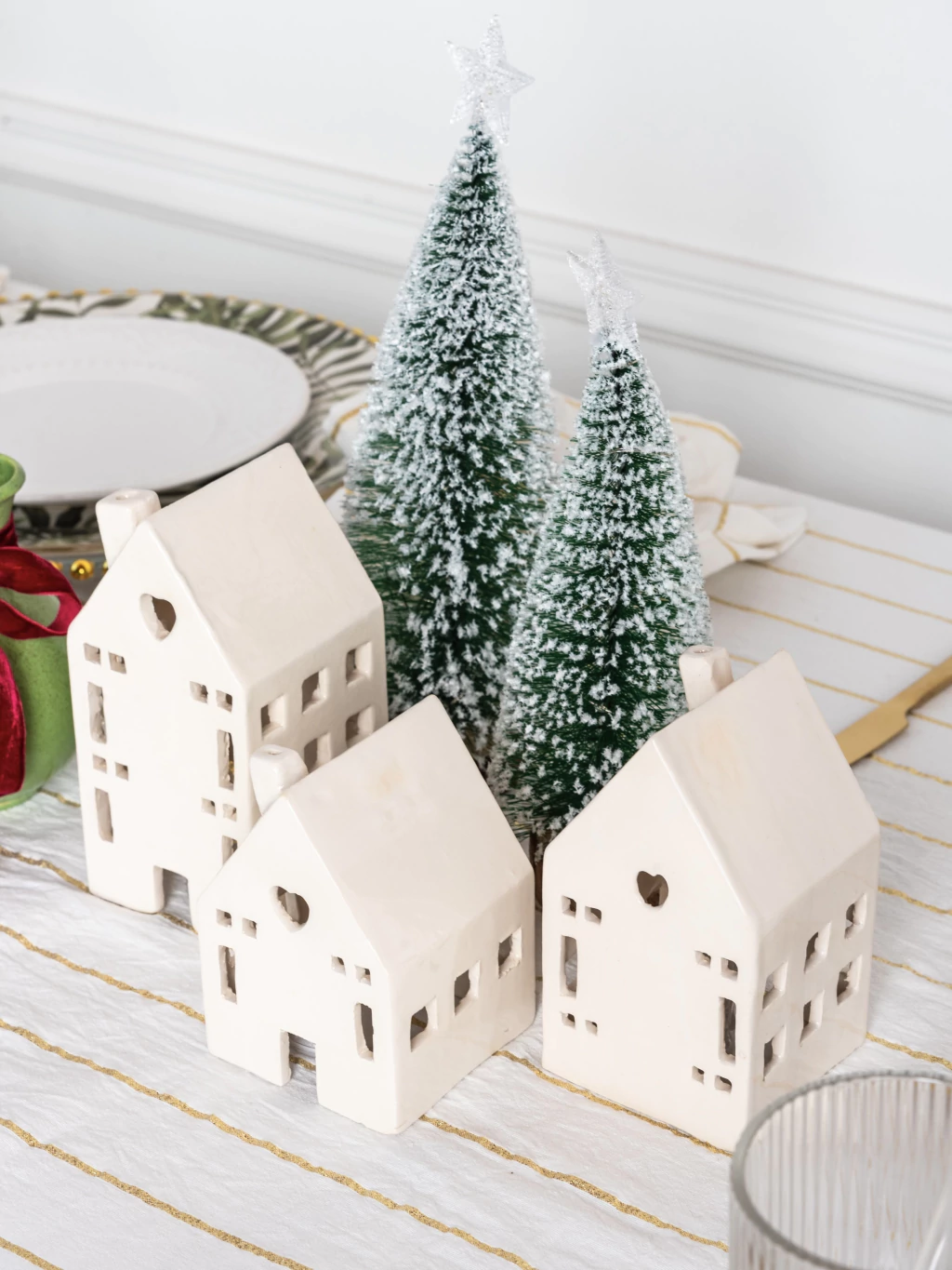 Llévate la colección completa de estas casitas de cerámica realizada 100% a mano en color crudo, con puertas y ventanillas que dejará pasar la luz de la velita. Incluye vela a pila para que dure toda la noche.