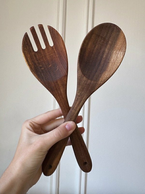 Set de cuchara y tenedor realizado en madera acacia con detalle pintado negro en el mango, ideal para complementar con nuestras nuevas ensaladeras.